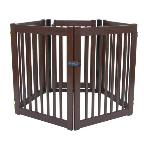 There's more to this beautiful hardwood pet gate than meets the eye. It's functional and convenient as well. With a swinging door that lets you through but keeps Fido where he ought to be, and a free standing design that's sturdy yet nice to your walls. It sets up in a flash and folds down flat when not in use. Features: · No assembly or installation required; just open the box and place in position · Gate panels rotate smoothly on a dual action hinge · Welded steel walk through frame with durable powder coat finish · Door swings in both directions and operates on a "nudge proof" tension hinge · Secure, top and bottom closures · Folds to store flat in a closet or under the sofa · Finely handcrafted of mortise and tenon construction-no nails, pins or screws · Uncompromising quality for lasting durability with an Eco-Friendly water based wood finish · Easily converts to a pen later with optional add on Pen Kit (see item # 492981) · Made in the U.S.A. Item Specifications: Size: 3 Panel (32"H, spans up to 60"W); Spacing between slats: 1 ¾" 5 Panel (32"H, spans up to 108"W); Spacing between slats: 1 ¾" Color: Black Cherry Mahoganyw